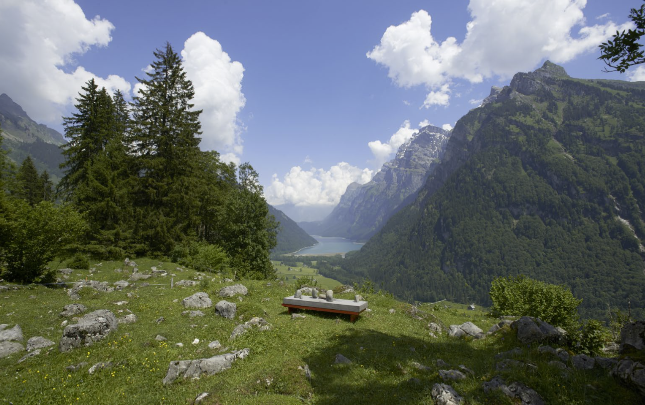 David Renggli zeigt im Kunsthaus Glarus sowie im Klöntal Betonskulpturen, sogenannte Daybeds (2013/2014), Sitz- und Liegebänke mit darauf arrangierten Flusskieseln und eingelegten Münzen. Als Sitzbänke bieten sie einerseits eine kontemplative Aussicht in die Landschaft und Natur des Klöntals, sie assoziieren aber gleichzeitig auch Freuds Therapeuten-Couch. Nicht auf einen Perserteppich, sondern auf Beton und Stein gebettet, fordert der Künstler mit dieser augenzwinkernden Geste die Ausruhenden dazu auf, ihre Haltung zur äusseren Welt wie auch zu sich selbst zu überprüfen. Die eine Bank befindet sich mit grandioser Aussicht auf den Klöntalersee auf der Richisauer Schwammhöhe, die andere im Kunsthaus Glarus.